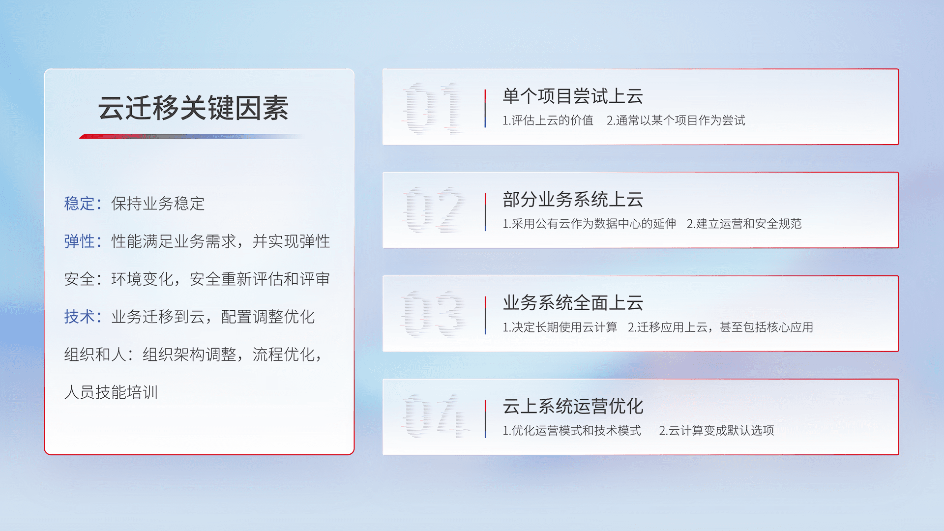 结合实际业务,,从规划设计、、、云平台选型、、云原生改造、、数据迁移、、、、集成交付,,,,迁移全过程为客户识别最佳上云路径,,,做好风险识别管理,,设计网络架构、、、身份权限、、安全审计合规、、、操作审计、、、、日志审计、、监控告警策略、、多站点容灾设计等,,,,对云上基础设施进行整体规划,,提升IT治理水平,,,,以满足弹性、、、、高可用、、、高性能的需求。。