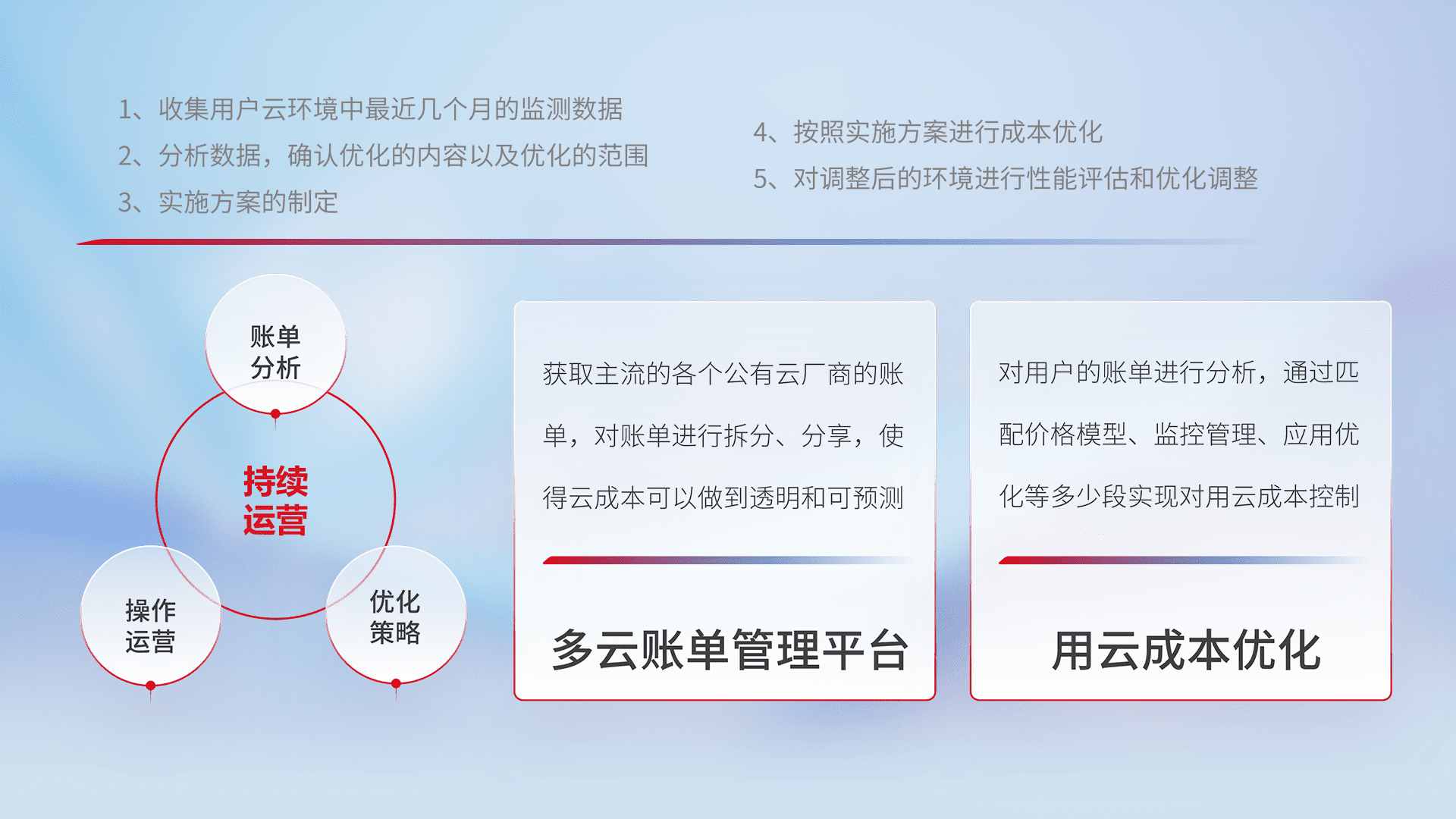 通过多云纳管,,以统一的资源数据模型把客户的云资源进行抽象和封装,,进而实现对多云资源的统一操作,,,,保障云资源管理的可靠性、、、稳定性与可用性。。。。量身定制化运维内容,,配置、、开发运维、、、、补丁管理、、、、备份、、监控、、认证和访问管理、、、、审计和日常巡检等,,,保障在用云过程中的可靠度,,稳定度以及高可用率。。